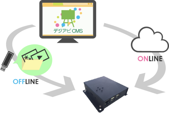 ONLINE:オンライン配信デジアピSTBをオンラインにしておけば、CMSのボタン一つでオンラインでデータを配信します。 遠隔地におかれたデジアピSTBでもコンテンツ更新、再生スケジュール設定、端末のネットワーク状況の確認などができます。 |