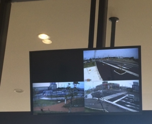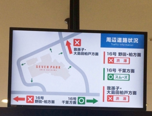 周辺道路混雑状況コンテンツ&操作用専用端末幹線道路沿いにあるセブンパーク アリオ柏では、お帰り時の渋滞ストレスをなくすため、リアルタイムの道路状況をデジタルサイネージに表示し、 幹線道路の混雑時には迂回路のご案内を行っています。 道路交通情報センター(JARTIC)の情報は、更新までにタイムラグが発生するため、防災センター内には、専用端末を設置し 状況に応じて即時に表示内容を切り替えられるようにしています。 |