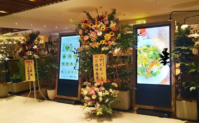 Salad Restaurant Mr.&Mrs.Green様 縦型サイネージ(右側)のプレイヤーとして利用(協力:アメイジングポケット様) |